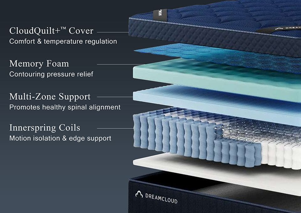 DreamCloud Ultra Hybrid is our most indulgent mattress yet, featuring a medium-soft, 7-layer design with 4x the cooling and memory foam support of the Classic Hybrid. Our 4” CloudQuilt+™ euro top and advanced phase change material keep you cool, while individually wrapped coils and a five-zone support layer deliver targeted comfort and stability. For your best sleep, night after night.